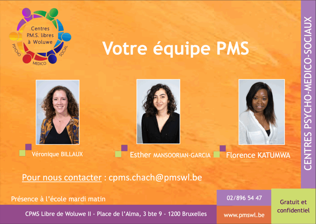 Vous pouvez trouver sur le site internet du PMS toute une série d’informations intéressantes, leurs coordonnées complètes ainsi que l’équipe qui travaille dans votre école.